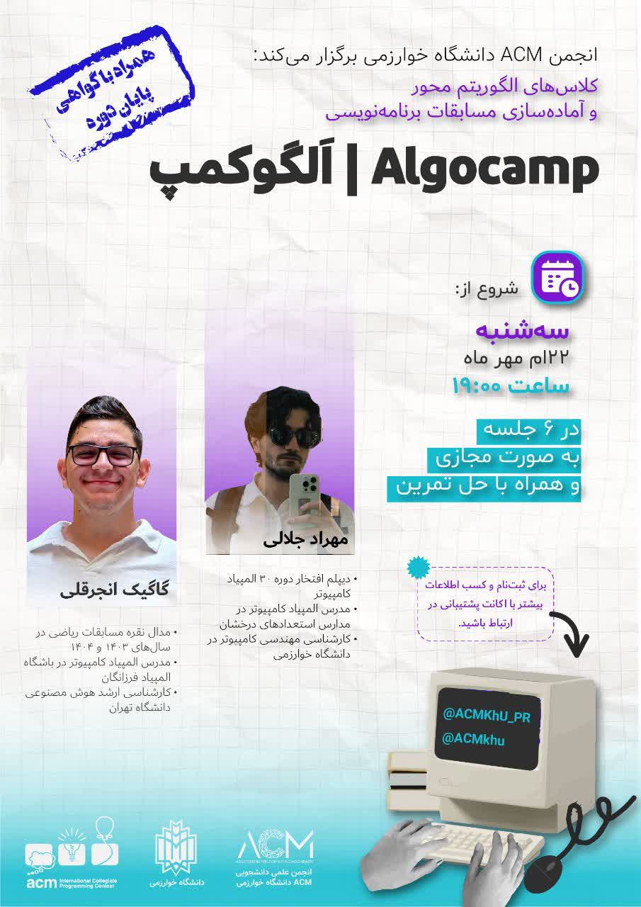ثبت‌نام در دوره: جهت ثبت‌نام و کسب اطلاعات بیشتر به اکانت‌ پشتیانی انجمن مراجعه فرمایید. ACMKhU_PR